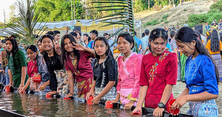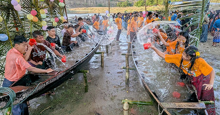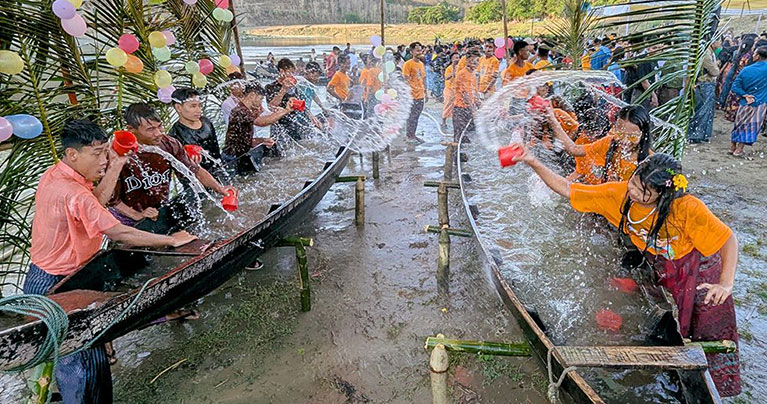 বান্দরবানে মারমা জনগোষ্ঠীর প্রধান সামাজিক উৎসব সাংগ্রাইয়ে জলকেলিতে মেতেছেন মারমা তরুণ-তরুণীরা।